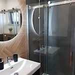 Die Villa in Makosieje verfügt über ein Badezimmer mit einer behindertengerechten Dusche, einer getrennten Toilette und einer Dusche. Ein Haartrockner und Handtücher sorgen für zusätzlichen Komfort.